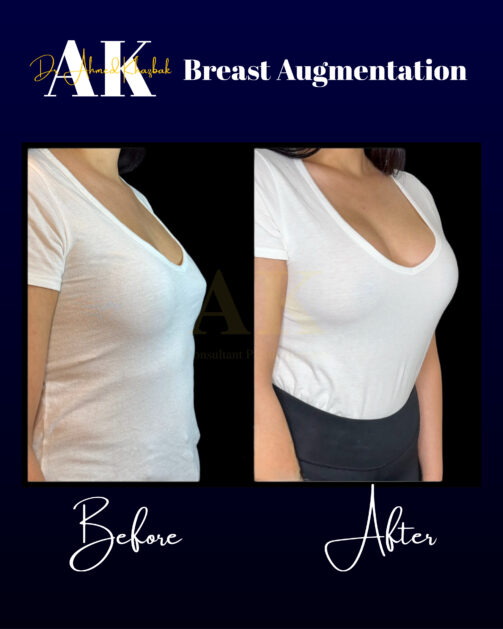 Breast augmentation uses implants or fat transfer to increase volume, helping achieve a fuller and more defined breast shape.